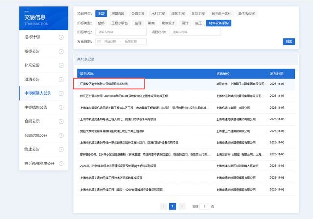 江湾校区融合创新二号楼项目电缆供货中标候选人公示(转发)