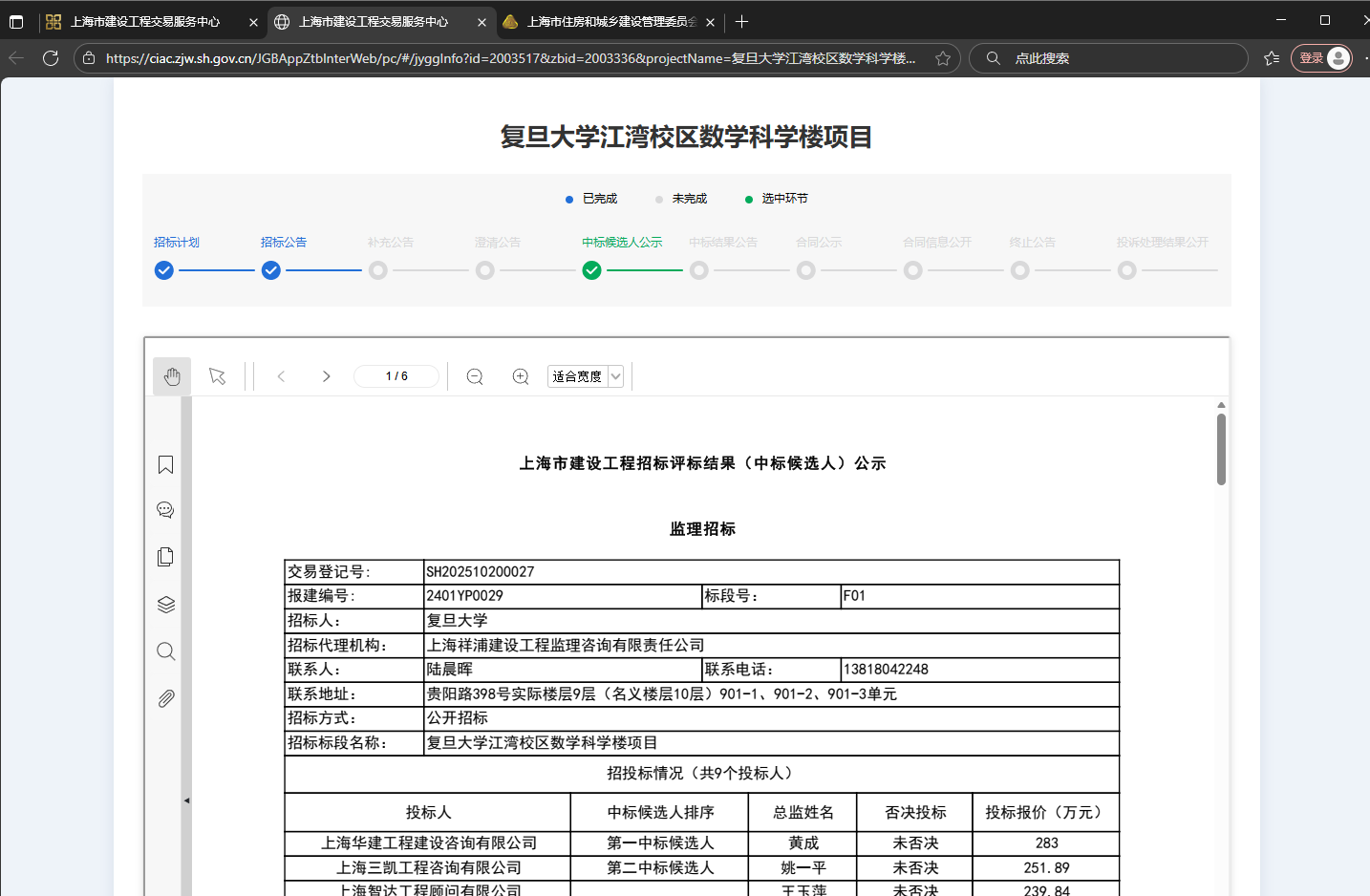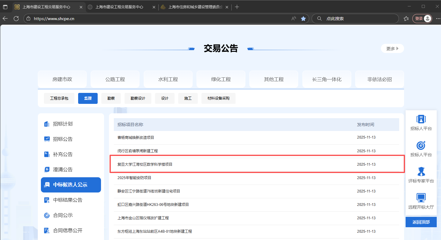 复旦大学江湾校区数学科学楼项目监理招标中标候选人公示(转发)