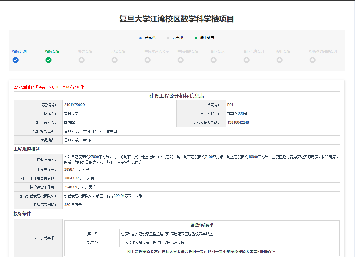 复旦大学江湾校区数学科学楼项目监理招标公告(转发)